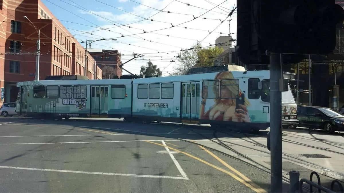 Secondly there's this photo taken of an entire tram emblazened with GTA V graphics — most notably "Beach Girl". And yes, trams are a big part of the public transport system in Melbourne, Australia. Thanks JCXtreme.