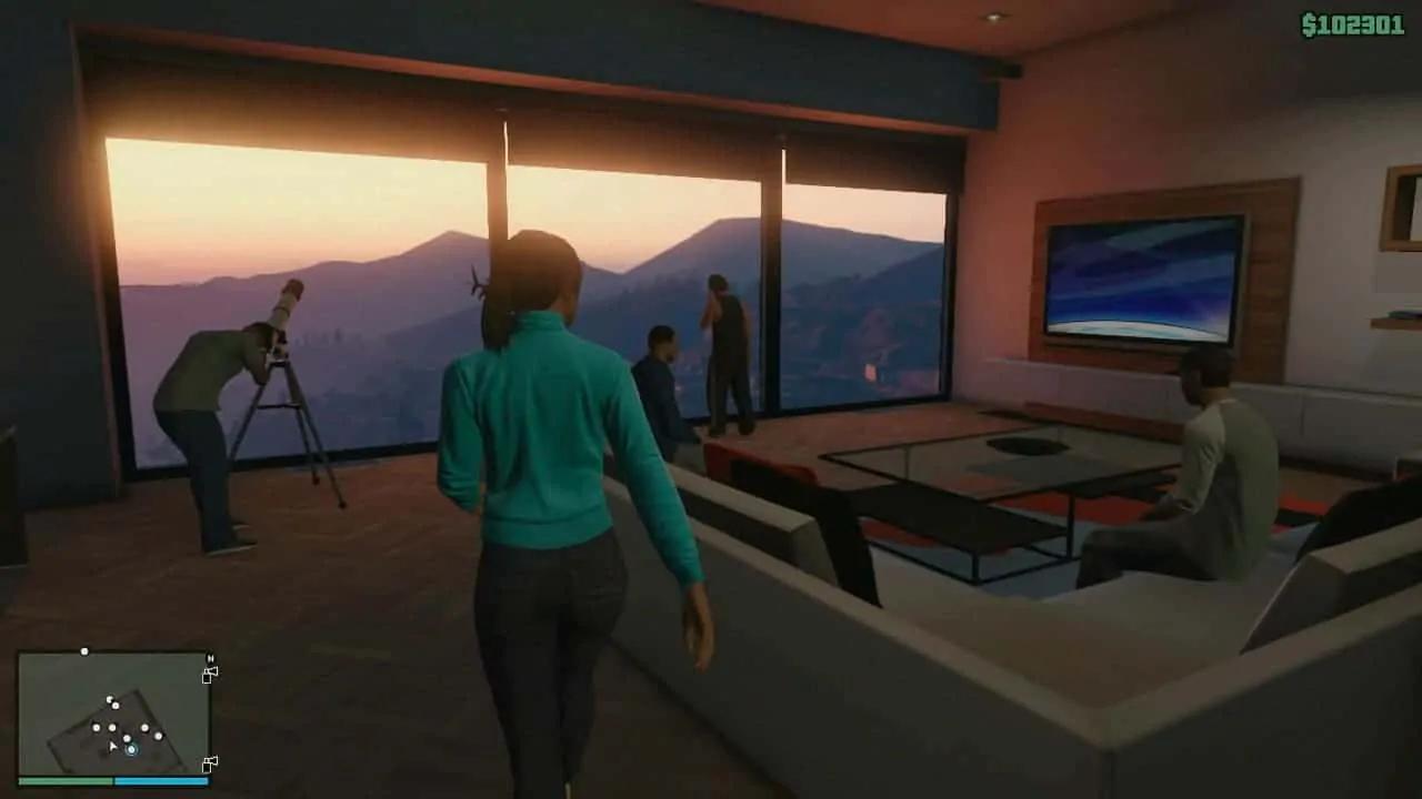 In this open-world action game, players assume the role of three criminals whose storylines intersect within the fictional city of Los Santos. Players can switch between each character to follow his storyline, completing missions which often include criminal activities (e.g., stealing cars, executing heists, assassinating targets). Players use pistols, machine guns, sniper rifles, and explosives to kill various enemies (e.g., rival gang members); players also have the ability to shoot non-adversary civilians, though this may negatively affect players' progress as a penalty system triggers a broad police search.