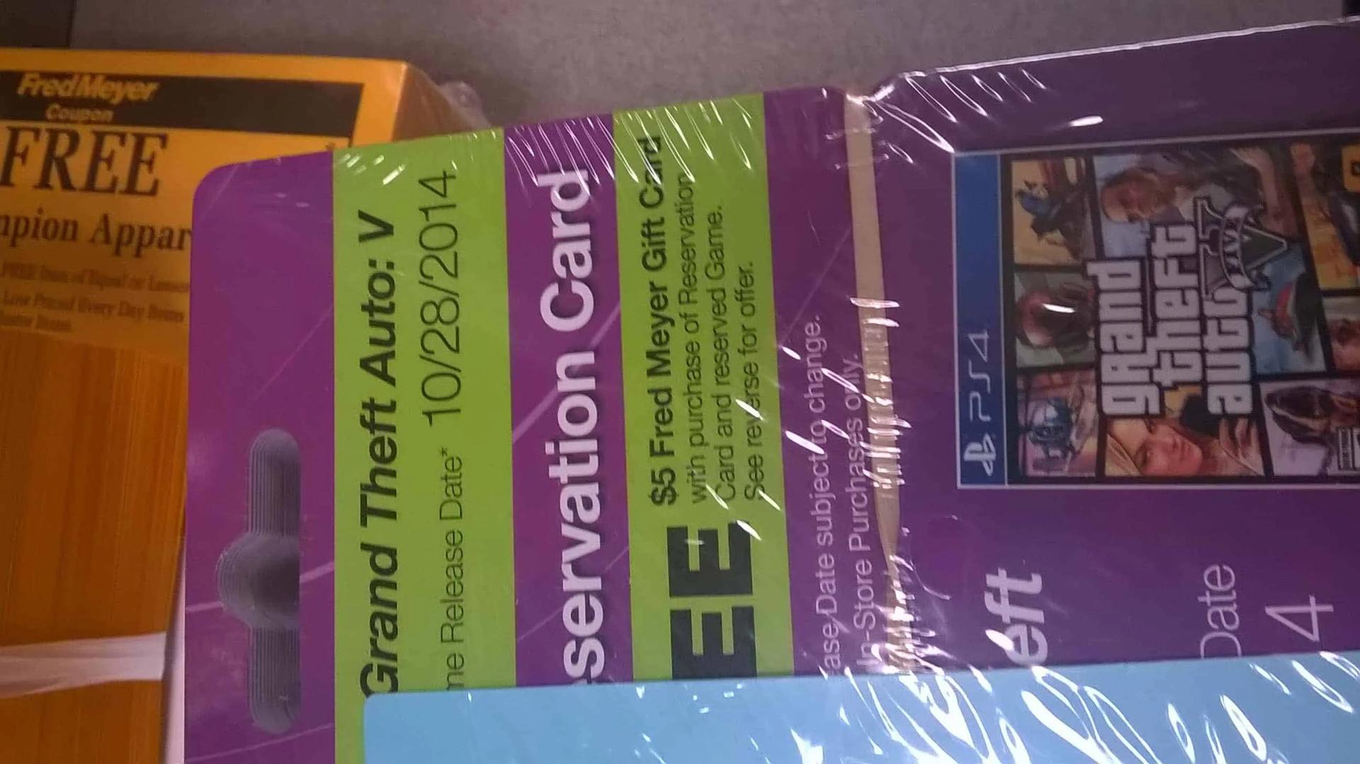 Someone just posted the Fred Meyer reservation card that you can see above for Grand Theft Auto V on the Playstation 4 (for those of you outside the US, Fred Meyer is a chain of super stores).