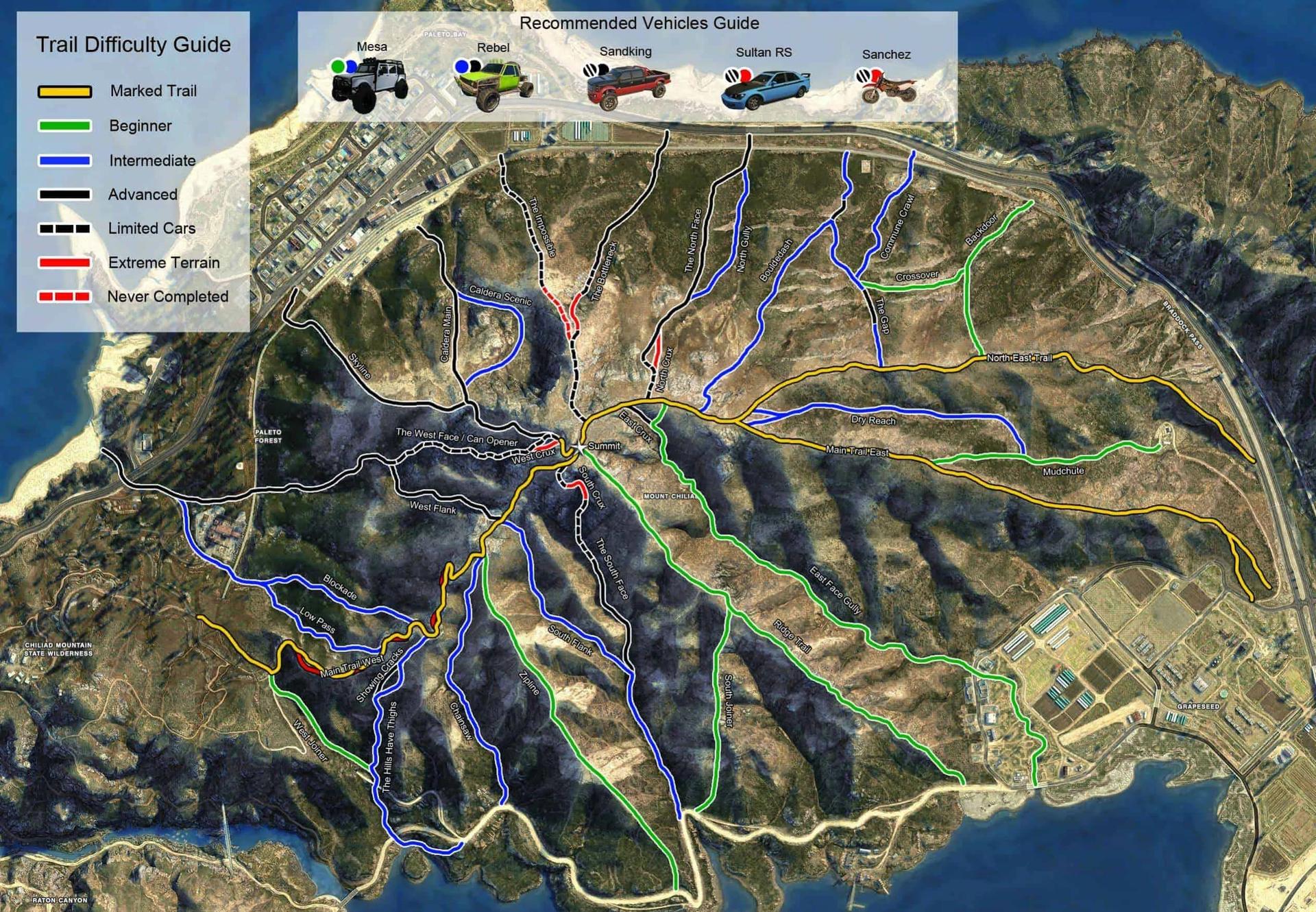 Reddit user TezzaMcJ has created a visual off-road trail guide for the areas in GTA 5 around Mt. Chiliad. It includes a map of the area, with the main trail labeled, a list of vehicles that work the best, and numerous trails marked according to difficulty.